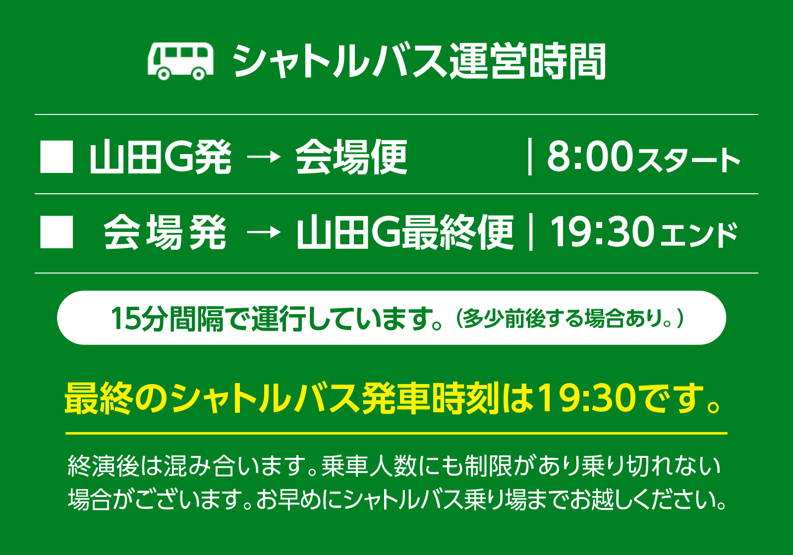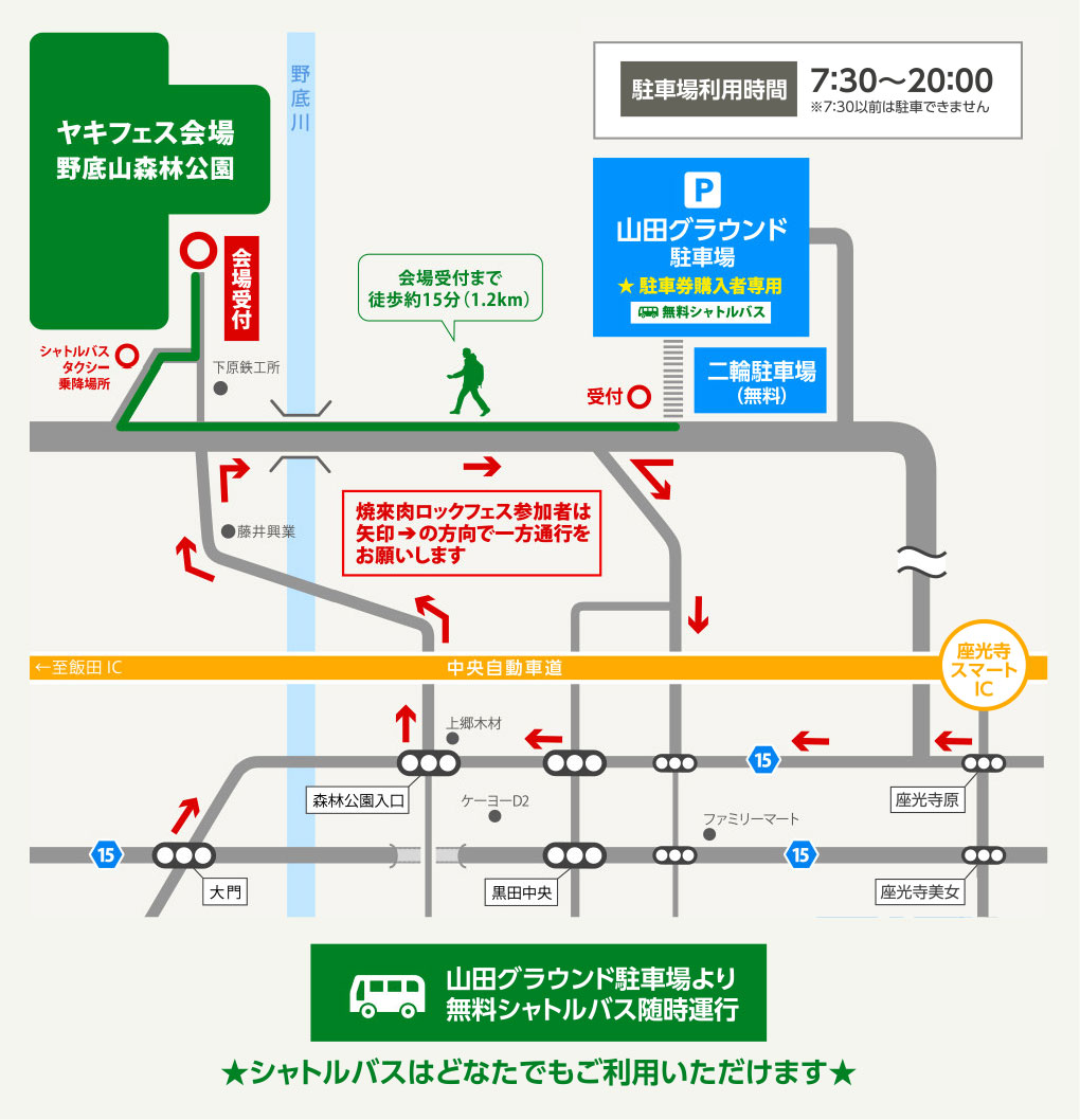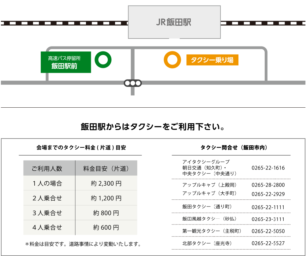 ※駐車券付きチケットをお持ちではない方(乗合せの方は除く)は、各駅・各停留所、周辺有料駐車場よりタクシーにての来場をお勧めしております。